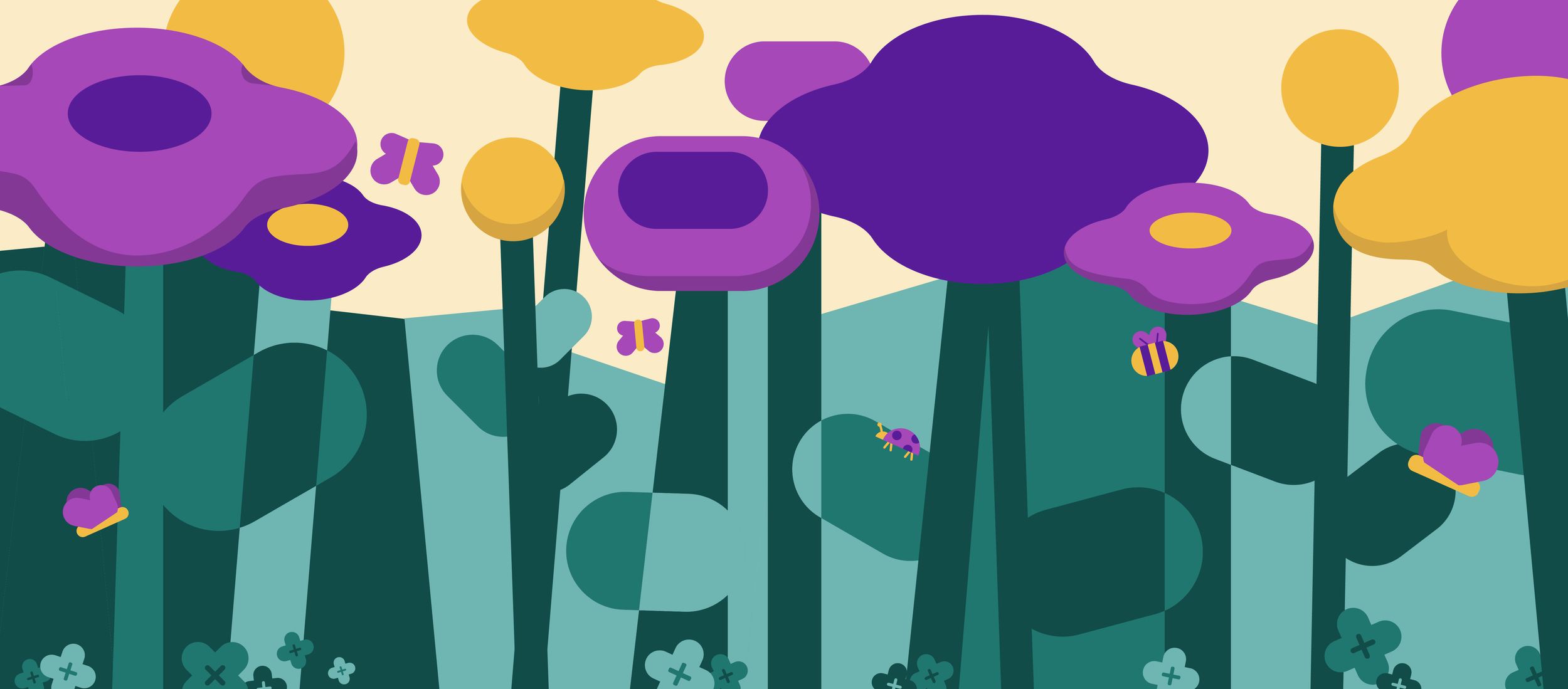 To open the room up vertically, I designed a mural that plays with scale: giant flowers can make humans feel tiny in comparison and can make the space feel taller. I also chose garden imagery to bring biophilia into the warehouse space. Using our brand’s language of abstract shapes, I depict flowers, leaves, grass, and insects.